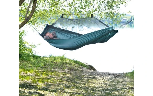 The breathable mosquito hammock, whose lying surface is as large as a bed, can be used on both sides, with or without a net. Access is through a zipper on the side, with the enclosed rope, the net can be pulled from the