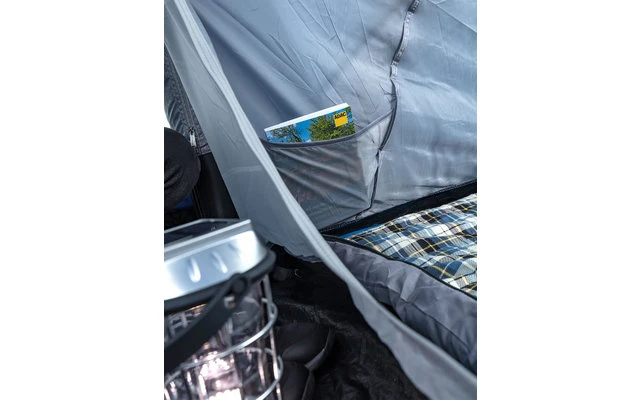 Inflatable, comfortable family tent made of high-quality ripstop polyester with plenty of space for up to 4 people. Quick and easy to pitch thanks to inflatable poles. Six windows (each ½ mosquito gauze, ½ clear film) provide the perfect feel-good atmosphere with sufficient light supply and ventilation. The firmly sewn-in tent floor offers additional comfort and protects against dirt, moisture and uninvited animals. In addition, the tent convinces with two hook-in sleeping cabins including mosquito gauze door, which can be removed if necessary to increase the living space. The spacious lounge invites you to linger and offers enough space for your furniture.