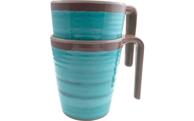 A lightweight and sturdy mug with handle. It is also virtually unbreakable, shatterproof and scratch resistant. The set consists of 4 cups. They are made of melamine, dishwasher safe and food safe.