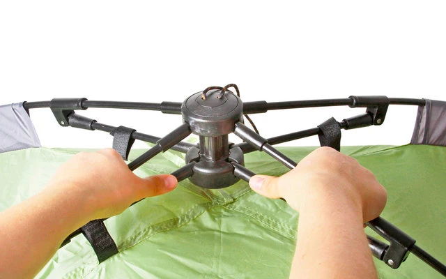 Automatic dome tent with double roof and practical porch. Thanks to modern poles with integrated cable pull technology, the tent can be erected and ready for use in seconds. Pre-assembled guy ropes. Compact packing size with low weight. With packing bag