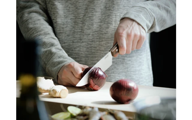 The Norr knife series offers a solid and authentic experience for classic cutting. High quality materials make it a sustainable and economical choice. The large Norr chef’s knife for all purposes has a strong blade that makes it perfect for most cutting tasks, such as chopping meat and vegetables. The blade is made of high quality German stainless steel. The handle material is sustainably sourced FSC (Forest Stewardship Council) 70% certified Norwegian maple wood treated with Kebony to increase stability and hardness.