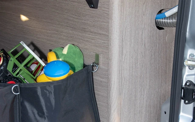The multi-container can be used lying down and also standing up, as a storage bag (without boxes). When not in use, it is folded up and stowed away to save space. Along the upper edge there are several semi-circular rings through which rubber clamps are passed, which are hooked onto wall hooks or Loxx press studs. Decoration material and transport boxes are not included.