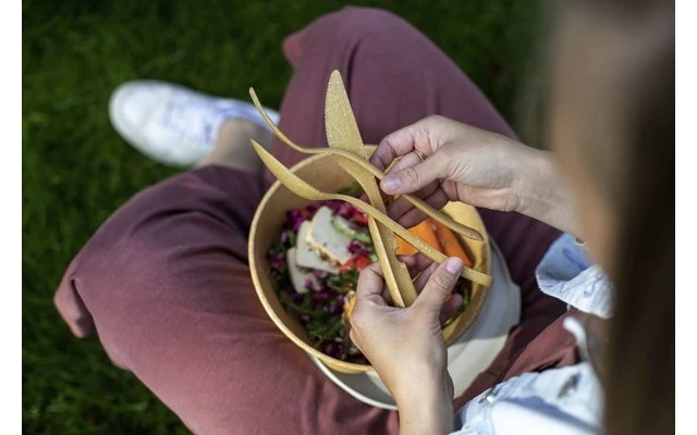 Knife, fork, spoon – done. Finally there is a reasonable to-go cutlery without frills and in a passable size. No more balancing food to your mouth! All parts can be put together and taken apart again without much guesswork. To detach, simply lift the knife at the tip and pull it out downward. All cutlery pieces fit comfortably in the hand and really fit in any pocket with their lightweight.