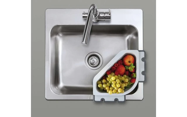 Drain-On corner strainer made of plastic, with variable anti-slip flaps for attachment to the sink rim.