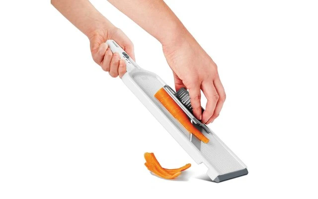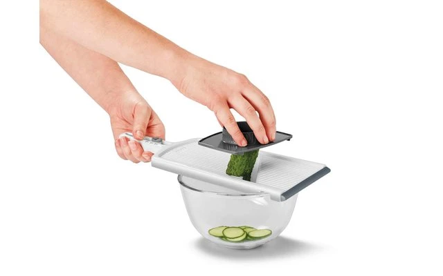 For individual adjustment of the desired thickness, you can set the slicer to 6 different levels for thicker or thinner slices. Especially useful is the separate safety slider, which allows you to fix the desired food without contact with your hands. This way, you won’t run the risk of getting your fingers between the blades. So you are guaranteed a safe and pleasant work!