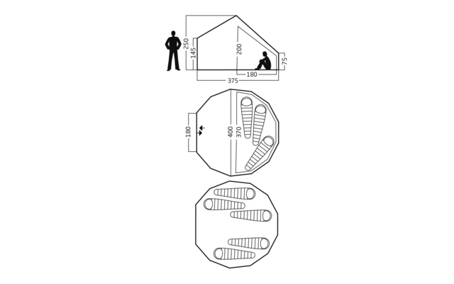 - overtent (L × W × H): 375 × 400 × 250 cm