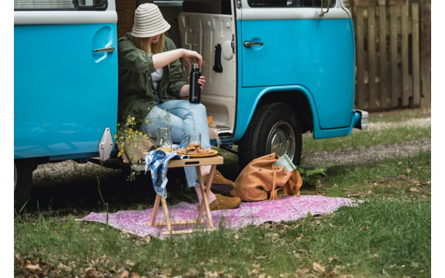 Double walled stainless steel thermos bottle with carrying handle and screw cap made of bamboo. Available in black, salmon, brown, white