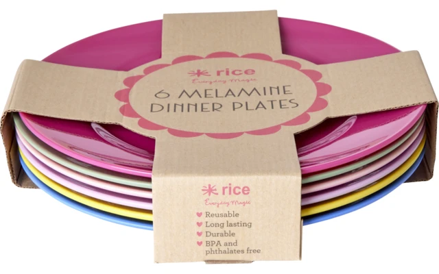 The classic round melamine plate in a pack of 6 in bright colors from Rice.