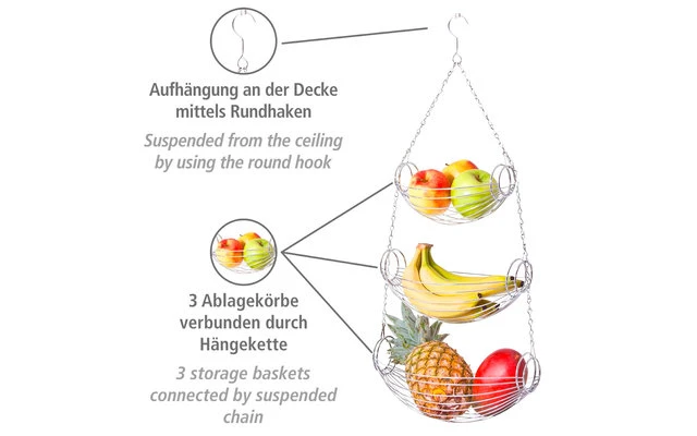 This beautifully designed kitchen traffic light is a useful helper in any household. With three storage baskets, it offers plenty of space for fruit, vegetables or small utensils. The practical round hook makes it easy to hang the traffic light from the ceiling to save space.