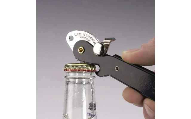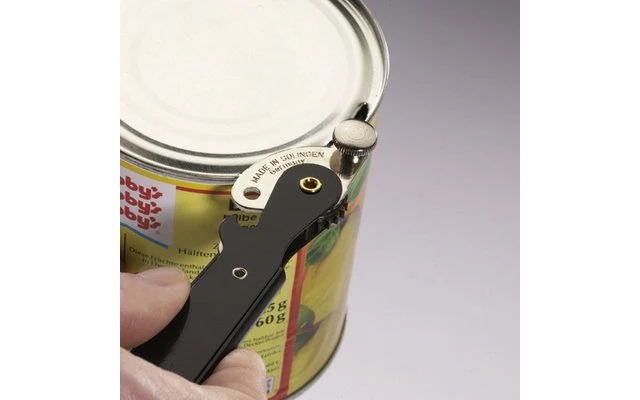 Practical lever can opener for opening round and square food cans, incl. cap lifter for opening bottles with crown caps.